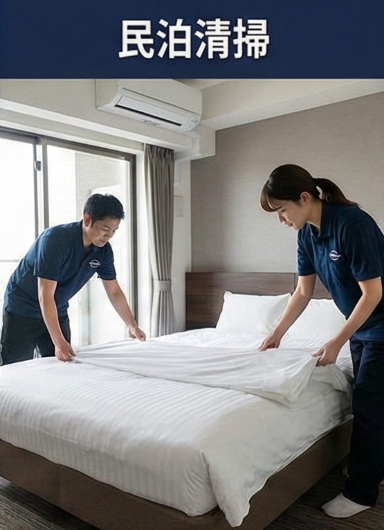 民泊施設の清掃、ベッドメイキング、備品補充まで対応します。